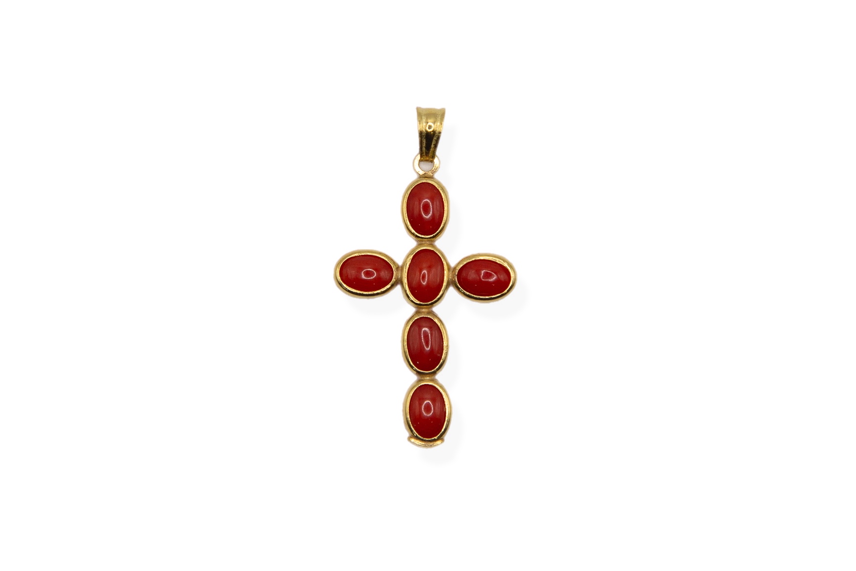 Cruz coral rojo oval con bisel de oro
