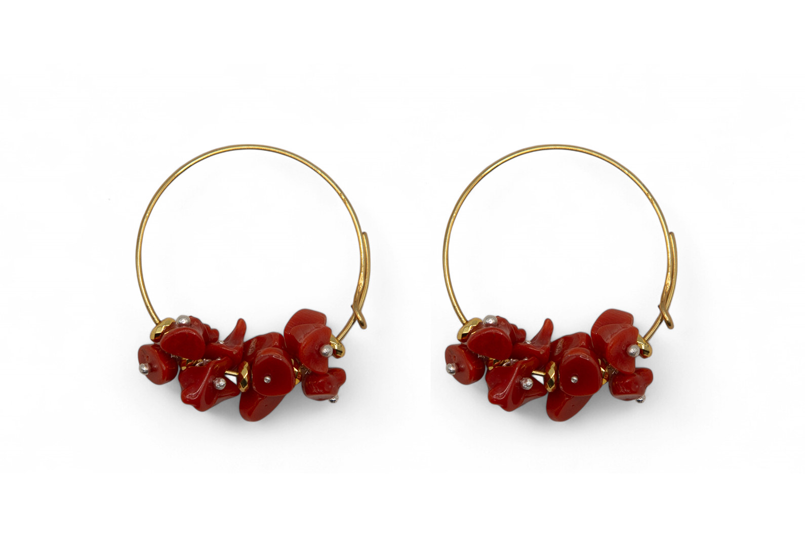 Aro bicolor, con tronquitos coral y bolitas en plata y plata con baño de oro.