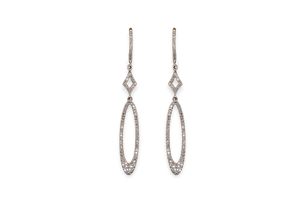 Pendiente largo, medio aro con rombo y ovalo calado en diamantes